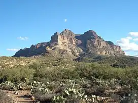Picketpost Mountain is located just outside the town of Superior, Arizona approximately 40 miles (64 km) east of the Phoenix Metro Area. The mountain is located in the southern desert region of Tonto National Forest near (but not within) the Superstition Mountains,[3] and is popular with hikers. The mountain is also well known for an oddly placed mailbox at the top of the mountain, which contains the log books for the Picketpost Mountain Trail.