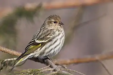 Adults are brown on the upperparts and pale on the underparts, with heavy streaking throughout. They have short forked tails. Their bills are conical like most finches but are more elongated and slender than those of other co-occurring finches. Variably, pine siskins have yellow patches on their wings and tails, which may also consist of white streaks on the wings. Although they can be confused by the more inexperienced for other finches or even American sparrows, pine siskins are distinguished by their heavy streaking, relatively slender bills, notched tail, yellow or whitish patches on the wings and smallish size.[8]