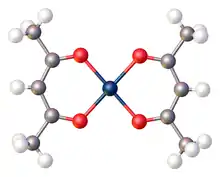 Platinum(II) bis(acetylacetonate) is the coordination compound with the formula Pt(O2C5H7)2, abbreviated Pt(acac)2. The homoleptic acetylacetonate complex of platinum(II), it is a yellow, benzene-soluble solid. According to X-ray crystallography, the Pt center is square planar.[2] The compound is a widely used precursor to platinum-based catalysts.[3]