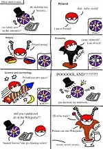 Some Polandball comics arise from the premise that some countries can go to space while Poland cannot.[21][22] One of the earliest Polandball comics begins with the premise that Earth will suffer an impact event, leading to all countries with space technology leaving Earth and going into orbit around the planet. At the end of the cartoon, Poland, still on Earth, is crying and says the phrase "Poland cannot into space".[lower-alpha 3][11][24] In this humorous way, other Countryballs halt all discussions with Poles on which country is superior.[5][11][19]
