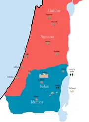 Pompey's incursion further south, into Judea, was occasioned on account of its inhabitants, under the leadership of Hyrcanus II and Aristobulus II, having ravaged Phoenicia and Pompey wanting to bring a stop to it.[81] The initial onslaught was disrupted by the Hasmonean Civil War, in which Pompey backed Hyrcanus II over his brother Aristobulus II. When he compelled the latter to surrender Jerusalem, its defenders took refuge in the Temple, which the Romans first stormed, then looted. Judea became a client kingdom ruled by Hyrcanus, while its northern section was incorporated into the Decapolis, a league of semi-autonomous cities (see Map). Both Judea and the League were made subordinate to the new province of Syria.[82]