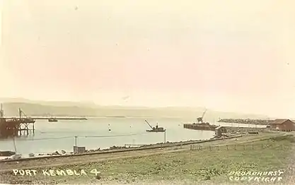From 1883, coal was shipped from an ocean jetty on the beach just to the north of a rocky headland lying to the north of Red Point and Boiler's Point. Old maps, from the 19th-century, show this rocky headland as "Red Point". Today, Red Point is the headland further south, directly opposite the Five Islands, which the older maps refer to as 'Five Islands Point'.[11][12][13][14] Red Point and the Five Islands provided some protection from southerly weather. This new port was named Port Kembla, after the Mount Kembla mine from where the coal was transported by rail.