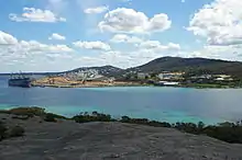 The port is located on the northern shore of Princess Royal Harbour, a natural harbour that is part of King George Sound. The city of Albany is adjacent to the port facilities. A dredged shipping channel that has a width of 145 metres (476 ft) and a minimum depth of 12 metres (39 ft) provides an approach to the port from King George Sound.[3] The channel to the port has Point Possession to the south and Point King, at the base of Mount Adelaide, to the north. The body of water between these two points is called Atatürk Entrance.