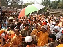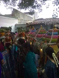 In Hinduism, parikarma of religious deities in a temple, sacred rivers, sacred hills and a close cluster of temples as a symbol of prayer is an integral part of Hindu worship.[3][6][7] Hindu temple architecture include various Pradakshina paths.[8] There could a parikarma path surrounding the chief deity, and several other broader paths concentric to main path through it is not uncommon to find non-concentric parikrama paths. At times the outermost parikrama path covers the whole village, town, city, thereby implying that the length of the path can stretch.[6][9] Parikrama is also done around the sacred Peepal tree, tulsi (Indian basil plant), and agni (sacred fire or the fire God),[10][11] and agni parikrama is a part of the Hindu wedding ceremony.[12][13]