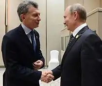 Many European leaders publicly expressed support for the new government of Macri. German Chancellor Angela Merkel congratulated Macri and requested that he make a state visit to Germany. She added that the two countries have "always been deeply tied", particularly in the area of science, which she deemed "one of the pillars" of the two countries' relations. Merkel also remarked that she would be "thankful" if the countries could strengthen cooperation "in all areas".[96] Spanish Prime Minister Mariano Rajoy, who has a close relationship with Macri, congratulated him and invited him to carry out a state visit "as soon as possible", stating that he is confident that the new government will "lead this new stage with success" while offering "the necessary support to consolidate the historical ties of friendship, fraternity and cooperation". The relationship between Spain and Argentina had become increasingly tense under the presidency of Cristina Kirchner, particularly after the Renationalization of YPF in 2012.[97] In a telegram to Macri, Russian President Vladimir Putin expressed his hopes that the two countries will continue to increase the "bilateral cooperation within diverse areas and the coordination of efforts to resolve current occurrences within the international agenda", adding that "the fundamental interests of the people of Russia and Argentina contribute to guarantee the stability and security of Latin America and the world", while reminding Macri that the countries had recently celebrated 130 years of diplomatic relations. Putin also made reference to the ongoing nuclear power and hydrocarbon extraction projects between the countries.[98] In February 2016, Macri received the President of Bulgaria, Rosen Plevneliev, at the Casa Rosada in Buenos Aires. Both leaders spoke of investments in each country; Plevneliev also met with entrepreneurs and visited the National Congress.[99]