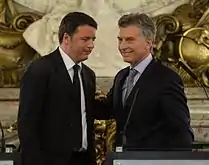 Italian Prime Minister Matteo Renzi called Macri on the night of his victory and stated that he would meet soon with the new president to "open a new page of collaboration between the two countries". He also highlighted the historical and cultural ties between the two countries, stating that "it is the country with the largest presence of Italian citizens in the world", numbering some 900,000. The Cambiemos victory also provoked much reaction in the domestic Italian press.[100] On 15 February 2016, Renzi met with Macri for a two-day state visit to Buenos Aires;[101] Renzi was the first European leader to meet Macri after the 2015 presidential election and the first Italian Prime Minister since Romano Prodi in 1998 to visit Argentina.[102]