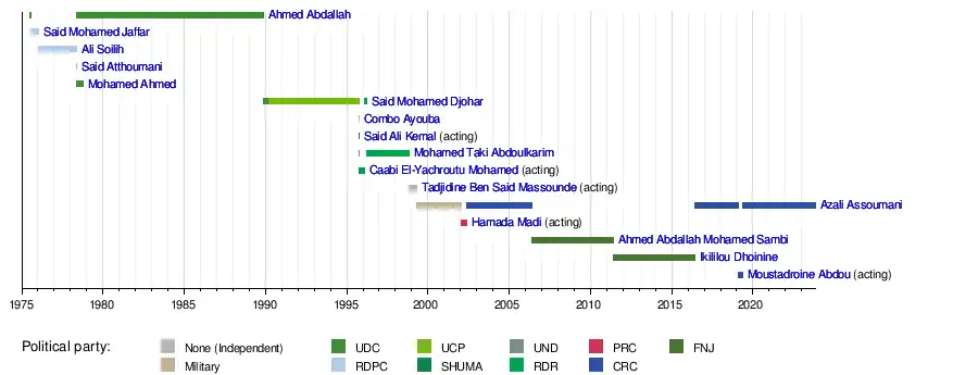 | (1) | Ahmed Abdallah (1919–1989) | Chairman of the Directorate (until 25 October 1978) President | 3 October 1978 | 26 November 1989 † | 11 years, 54 days | UDC | |