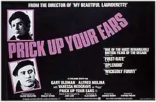Prick Up Your Ears is a 1987 British film, directed by Stephen Frears, about the playwright Joe Orton and his lover Kenneth Halliwell. The screenplay was written by Alan Bennett, based on the 1978 biography by John Lahr. The film stars Gary Oldman as Orton, Alfred Molina as Halliwell, Wallace Shawn as Lahr, and Vanessa Redgrave as Peggy Ramsay.