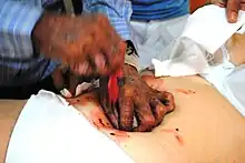 Although psychic surgery varies by region and practitioner, it usually follows some common lines. Without the use of a surgical instrument, a practitioner will press the tips of his/her fingers against the patient's skin in the area to be treated. The practitioner's hands appear to penetrate into the patient's body painlessly and blood seems to flow. The practitioner will then show organic matter or foreign objects apparently removed from the patient's body, clean the area, and then end the procedure with the patient's skin showing no wounds or scars.[8]