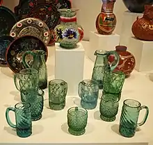 Drinking glasses have colorful names and can reflect a customer's ability to drink pulque. Large two-liter glasses are called macetas (flower pots), one-liter glasses are called cañones (cannons), half–liters are called chivitos (little goats), quarter-liter glasses are catrinas (dandies), and eighth-liter glasses are tornillos (screws). Traditionally, these glasses are made from a greenish, hand blown glass.[8] Pulque can be drunk straight from the barrel or can have a number of additives, such as fruit or nuts, added. Pulque prepared this way is called curado or cured.[35]