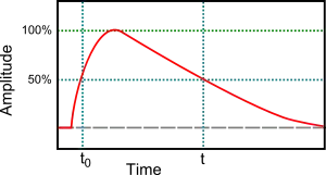 The interval between the 50% points of the final amplitude is usually used to determine or define pulse duration, and this is understood to be the case unless otherwise specified. Other fractions of the final amplitude, e.g., 90% or 1/e, may also be used, as may the root mean square (rms) value of the pulse amplitude.