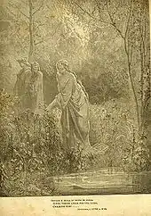 The gate of Purgatory, Peter's Gate, is guarded by an angel bearing a naked sword, his countenance too bright for Dante's sight to sustain. In reply to the angel's challenge, Virgil declares that a lady from heaven brought them there and directed them to the gate. On Virgil's advice, Dante mounts the steps and pleads humbly for admission by the angel, who uses the point of his sword to draw the letter "P" (signifying peccatum, sin) seven times on Dante's forehead, bidding him "take heed that thou wash / These wounds, when thou shalt be within."[28] With the passage of each terrace and the corresponding purgation of his soul that the pilgrim receives, one of the "P"s will be erased by the angel granting passage to the next terrace. The angel at Peter's Gate uses two keys, silver (remorse) and gold (reconciliation) to open the gate – both are necessary for redemption and salvation.[26] As the poets are about to enter, they are warned not to look back.