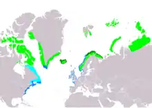 The purple sandpiper's breeding range extends from the arctic islands of northern Canada, eastwards to Greenland, Iceland, Svalbard and northern Scandinavia across to Western Siberia and the Taymyr Peninsula. In the high arctic the sandpiper breeds at low altitude on the tundra, sometimes far from the coastline, but in the subarctic regions of Sweden and Norway it breeds on barren mountain sides near the limit of the frozen ground. Birds breeding at high latitudes migrate south and spend the winter on rocky shores on both sides of the north Atlantic. They winter along the North America coast as far south as South Carolina and on the eastern Atlantic coast as far south as France and northern Iberia.[12]