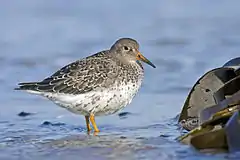 The purple sandpiper (Calidris maritima) is a small shorebird in the sandpiper family Scolopacidae. This is a hardy sandpiper that breeds in the arctic and subarctic regions of Eurasia and North America and winters further south on the Atlantic coast.