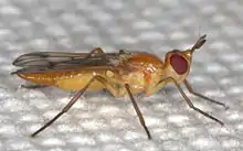 The Pyrgotidae are an unusual family of flies (Diptera), one of only two families of Cyclorrhapha that lack ocelli. Most species are "picture-winged" (i.e., have patterns of bands or spots on the wings), as is typical among the Tephritoidea, but unlike other tephritoids, they are endoparasitoids; the females pursue scarab beetles in flight, laying an egg on the beetle's back under the elytra where the beetle cannot reach it. The egg hatches and the fly larva enters the body cavity of the beetle, feeding and eventually killing the host before pupating. In the United States, some species of Pyrgota and Sphecomyiella can be quite common in areas where their host beetles (typically the genus Phyllophaga, or "June beetles") are abundant. Like their host beetles, these flies are primarily nocturnal, and are often attracted to artificial lights.[2][3]
