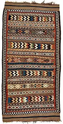 During World War I, the Kashkuli khans supported the British in their struggle against Ṣowlat-al-Dowla (Iyl-khan) and the German agent, Wilhelm Wassmuss. After the war, Ṣowlat-al-Dowla punished the Kashkuli. He dismissed the Kashkuli leaders who had opposed him and "deliberately set out to break up and impoverish the Kashkuli tribe".[19] Two sections of the tribe, which consisted of elements which had been loyal to Ṣowlat-al-Dowla, were then separated from the main body of the tribe and given the status of independent tribes, becoming the Kashkuli Kuchak ("Little Kashkuli") and Qarachahi tribes. The remaining tribe became known as the Kashkuli Bozorg ("Big Kashkuli") tribe.[20] The Kashkuli Bozorg tribe comprised 4,862 households in 1963. As Oliver Garrod observed, the Kashkuli Bozorg are "especially noted for their Jajims, or tartan woolen blankets, and for the fine quality of their rugs and trappings".[21]