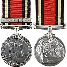 The Queen's Medal for Champion Shot (French: Médaille de la Reine pour tireur d'élite[1]) is a Canadian medal instituted on 28 August 1991 to honour one member each of the Canadian Armed Forces (CF) Regular Force and either the CF Reserve Force or the Royal Canadian Mounted Police (RCMP) who obtained the highest aggregate score in stages one and two of the Queen's Medal Competition. It replaced its British counterpart, the Queen's Medal for Champion Shots in the Military Forces, after 1992. In respect of the Canadian Regular Force, the British medal could only be won by Army members, whereas the Canadian medal can be won by members of the Canadian Forces.