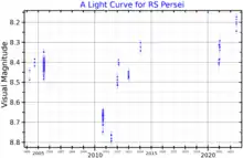 RS Persei is classified as a semiregular variable star, with its brightness varying from magnitude 7.82 to 10.0 over 245 days,[2] Detailed studies show that it also pulsates with a long secondary period of 4,200±1,500 days.[11]