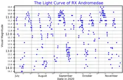 RX Andromedae is a variable star in the constellation of Andromeda. Although it is classified as a dwarf nova of the Z Camelopardalis (UGZ) type, it has shown low-luminosity periods typical of VY Sculptoris stars.[10] However, for most of the time it varies from an apparent visual magnitude of 15.1 at minimum brightness to a magnitude of 10.2 at maximum brightness, with a period of approximately 13 days.[3]