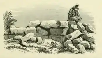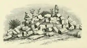 South-west of the village is another ruin, which seems to be a chapel, but is not facing directly to the east. The foundations only remain, the length direction being 19°, and the apse at the north-east end 10 feet 4 inches diameter. The total interior length is 9 feet, plus 5 feet 2 inches the radius of the apse, or 14 feet 2 inches. The wall is 5 feet thick, of two courses of ashlar, with a core of rubble in soft white mortar. The stones in the ashlar are 2 feet long, 1 foot thick, and 1 1/2 feet in height. Several flagstones lie about. The stone is hard; the masonry is not drafted.[16]