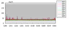 Radiation fluctuated widely on the site after the tsunami and often correlated to fires and explosions on site. Radiation dose rates at one location between reactor units 3 and 4 was measured at 400 mSv/h at 10:22 JST, 13 March, causing experts to urge rapid rotation of emergency crews as a method of limiting exposure to radiation.[100] Dose rates of 1,000 mSv/h were reported (but not confirmed by the IAEA)[101] close to the certain reactor units on 16 March, prompting a temporary evacuation of plant workers, with radiation levels subsequently dropping back to 800–600 mSv/h.[102] At times, radiation monitoring was hampered by a belief that some radiation levels may be higher than 1 Sv/h, but that "authorities say 1,000 millisieverts [per hour] is the upper limit of their measuring devices."[103]