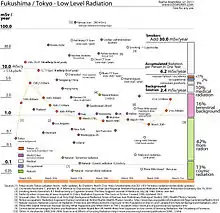 The radiation effects from the Fukushima Daiichi nuclear disaster are the observed and predicted effects as a result of the release of radioactive isotopes from the Fukushima Daiichii Nuclear Power Plant following the 2011 Tōhoku 9.0 magnitude earthquake and tsunami (Great East Japan Earthquake and the resultant tsunami).[3][4] The release of radioactive isotopes from reactor containment vessels was a result of venting in order to reduce gaseous pressure, and the discharge of coolant water into the sea.[5] This resulted in Japanese authorities implementing a 30-km exclusion zone around the power plant and the continued displacement of approximately 156,000 people as of early 2013.[4][6] The number of evacuees has declined to 49,492 as of March 2018.[7] Radioactive particles from the incident, including iodine-131 and caesium-134/137, have since been detected at atomospheric radionuclide sampling stations around the world, including in California and the Pacific Ocean.[8][9][10]