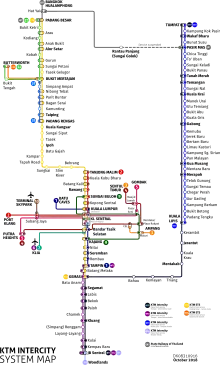 Currently, a total of 767 km from the 1,776 km railway network is double-tracked and electrified.[11] The tracks include a portion of the West Coast Line (from Gemas to Padang Besar) as well as the entire Port Klang and Batu Caves branch lines. The rail lines from Tanjung Malim to Pulau Sebang/Tampin, Padang Besar to Padang Rengas, as well as the Port Klang, Batu Caves and Butterworth branch lines are used for commuter rail services.[12]