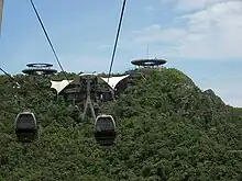 The Langkawi Cable Car, or Langkawi SkyCab, is a 2.2 km (1.4 mi) cable transport system transporting tourists to the peak of Mount Machinchang. The journey time takes around 15 minutes, and upon arrival, tourists are able to go to the Langkawi Sky Bridge via an inclined elevator. The construction of the cable car was realised following a survey of the most feasible method of public transportation on Mount Machinchang. The cable car commenced operations in 2003, owned by the Langkawi Development Authority (LADA) and operated by Panorama Langkawi Sdn Bhd.[43][44][45]