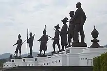 The park consists of three distinct areas. The first, covering an area of five rai (8,000 m2), is dominated by the statues of seven notable Thai kings. They are King Ram Khamhaeng (reigned 1279-1298) of the Sukhothai period, King Naresuan (1590-1605) and King Narai (1656-1688) of the Ayutthaya period, King Taksin (1767-1782) of the Thonburi period, and King Rama I (1782-1809), King Mongkut (1851-1868), and King Chulalongkorn (1868-1910) of the Rattanakosin period. Each statue is made of bronze, with an average height of 13.9 meters. They were designed by Thailand's Fine Arts Department. Casting of the statues and construction of the multi-purpose plaza took 10 months, from November 2014 to August 2015. There are plans to add statues of two additional kings in the future.[3]
