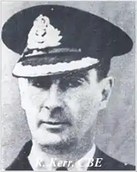 Kerr was to have then received an appointment to command the Flotilla leader HMS Duncan, where he would be captain (D) of the 8th Destroyer Flotilla. The appointment was cancelled before he could take it up, however.[1] Instead, after a period of training, he became commander of HMS Hardy and captain (D) of the 2nd Destroyer Flotilla. During this period he served under Vice-Admiral John Tovey, and impressed both him, and the Commander-in-Chief Mediterranean Admiral Sir Dudley Pound.[1] Kerr then took command of HMS Broke and the 15th Destroyer Flotilla, later transferring to the shore establishment HMS Cochrane, at Rosyth on 30 August 1939. He remained at Rosyth with the Rosyth Destroyer Force until 24 January 1940, spending time on the staff of the commander-in-chief, Rosyth. He was awarded the CBE in 1940.[1]