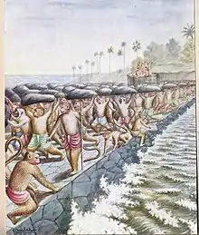 The army deliberate over how to cross the ocean to Lanka. The deity of the seas tells Rama of the boon obtained by the monkey brothers Nila and Nala and that they have the power to build a bridge to link the seashore to Lanka.[43]