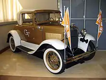 Johnson had purchased the car from a junkyard in 1956. Johnson and his son, Craig, would restore the car as a father-son project while Craig attended the Georgia Military Academy.[18] The two spent two years and over $1,800 restoring the vehicle.[19] Johnson used spare parts from many different sources to refurbish the rusty hulk. He bought the mahogany dash from a parts dealer in Caracas, Venezuela and used Convair 440 aluminum sheets to replace the flooring. After Craig graduated from high school, he attended Florida State on a track scholarship. In 1960, Craig's track team would be in Atlanta competing against Tech. Johnson, wanting to see his son compete, took the Model A to Tech campus, parked it near Towers dormitory, and went to watch Craig compete.[19]