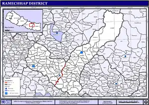 Ramechhap District (Nepali: रामेछाप जिल्लाListen), a part of Bagmati Province, is one of the seventy-seven districts of Nepal, a landlocked country of South Asia. The district, known as Wallo Kirat Ramechhap, has its district headquarters in Manthali and covers an area of 1,546 km2 (597 sq mi) with a population (2011) of 202,646[1] and a density of 137.4 per km2. It has 11 post offices, with the District Post Office (D.P.O.) bearing the postal code 45400.