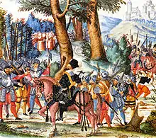 The Rappenkrieg was a peasant uprising lasting from 1591–1594, involving a conflict between the Swiss city of Basel and the surrounding Prince-Bishopric of Basel. The uprising was caused by the increase in the rate of sales tax on wine and meat. After several years the conflict was ended through negotiations headed up by the Basel merchant turned politician Andreas Ryff.