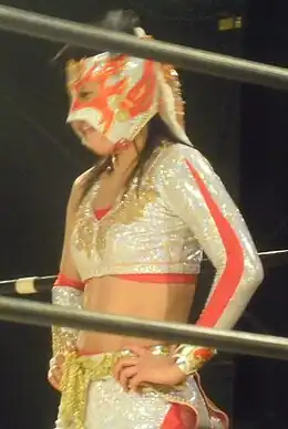 Trained by Emi Sakura at the Gatokunyan dojo, she made her debut under the ring name Rei (Japanese for "Zero") on September 15, 2003, facing Sakura in a losing effort at a show in Korakuen Hall.[4][8] When Sakura left Gatokunyan in April 2006 to form Ice Ribbon, Rei was one of only few of her trainees, who chose not to leave with her, but instead remained with Gatokunyan until the promotion folded in early 2007.[8] The summer of 2007 also saw the folding of the JDStar promotion, where Rei made appearances for six months under a different mask and the ring name Caribbean Moon, working as a member of the Caribbean Gundan stable alongside Caribbean Kim and Caribbean Rum, with all three having characters inspired by the Pirates of the Caribbean films.[9][10][11] Under the new ring name Ray,[12] she then began working regularly for Mariko Yoshida's Ibuki promotion, which had the goal of introducing the next generation of joshi stars to the world of professional wrestling. While performing in the promotion, Ray also underwent further training under Yoshida, alongside the likes of Hiroyo Matsumoto, Misaki Ohata and Tomoka Nakagawa.[13] In 2009, Ray joined Nanae Takahashi's Passion Red stable, which she would represent in promotions such as NEO Japan Ladies Pro Wrestling, Big Japan Pro Wrestling (BJW), JWP Joshi Puroresu and Oz Academy, performing under the ring name Passion Ray.[14][15][16][17][18] When Ibuki ceased its operations in early 2010,[19] the Ray character went inactive as its performer began working for Smash unmasked. However, on January 25, 2011, Ray held a press conference, announcing that she was making a comeback on February 5, now working as a freelancer on the Japanese independent circuit.[20]