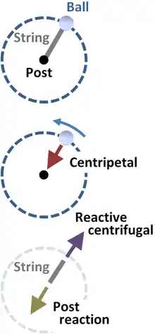The figure at right shows a ball in uniform circular motion held to its path by a string tied to an immovable post. In this system a centripetal force upon the ball provided by the string maintains the circular motion, and the reaction to it, which some refer to as the reactive centrifugal force, acts upon the string and the post.