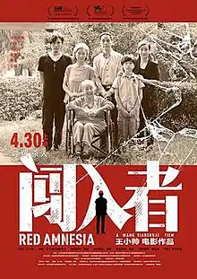 Red Amnesia (Chinese: 闯入者) is a 2014 Chinese thriller film directed by Wang Xiaoshuai.[1] The film deals with the psychological impact of an elderly retired widow (played by Lü Zhong)'s past. Wang considers Red Amnesia to be the last film of his Cultural Revolution trilogy, which includes 2005's Shanghai Dreams and 2011's 11 Flowers.[2] The film was released on April 30, 2015.