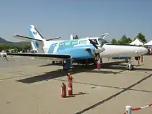 The F406 Caravan II is a twin turboprop engined, fourteen-seat low-wing monoplane of conventional aluminium and steel construction. It is a development of the Cessna 404 Titan with two Pratt & Whitney PT6A turboprop engines. The aircraft first flew on 22 September 1983,[2] and was produced by Reims Aviation until the company's 2013 demise.[3] The F406 is aimed at passenger and small cargo transport, and civilian and military surveillance. For extra cargo capacity, a cargo pod can be fitted to the belly of the aircraft.