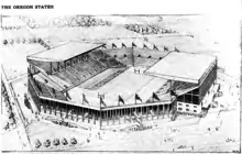 From 1910 to 1953, the Beavers played their home games at Bell Field (now the site of the Dixon Recreation Center), and also played as many as four games a year at Multnomah Stadium (now Providence Park) in Portland.[10] In 1948, Oregon State president August L. Strand, athletic director Spec Keene, and Portland businessman Charles T. Parker (1885–1977)[13] met to plan a replacement for Bell Field. Parker, a 1907 alumnus,[10] kicked off the stadium fundraising campaign in 1949 and made significant contributions of his own.[10][14] In 1952, construction of the stadium began; for Parker's efforts and contributions, the stadium was named in his honor.[15] The first game was played on Homecoming, November 14, 1953, and the Beavers defeated Washington State 7–0.[4][10] At the time, it seated 28,000.[16]