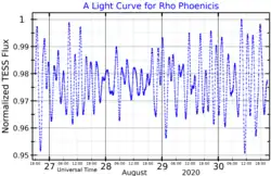 This star is classified as an F-type giant with a spectral type of F3III, and in the HR diagram it occupies in the lower part of the instability strip. Rho Phoenicis is Delta Scuti variable, changing its visual apparent magnitude between 5.17 and 5.27 with a period of around 0.1–0.2 days.[5][3] The pulsation period seems to vary in a timescale of weeks, which indicates the star is not a simple radial pulsator.[10] The analysis of the temperature variations over the pulsation cycles also supports this conclusion.[11] It is not clear if the pulsation period really is variable, or if the light curve is simply the sum of multiple stable pulsation frequencies.[12]