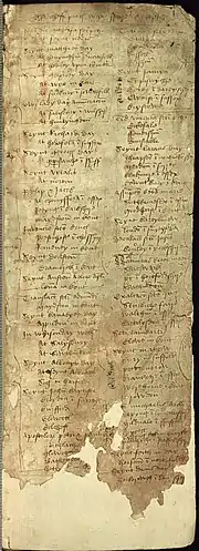Richard Hill, originally a Hitchin man, became first a servant of a certain London alderman called Wynger, then eventually a London merchant trading with the Low Countries.[2][5] Internal evidence shows that he compiled his commonplace book between the years 1503 and 1536.[6] Ownership inscriptions in different parts of the manuscript indicate that after Hill's death it became the property first of his eldest son, John Hill, and later in the 16th century of one John Stokes. A series of jottings dated 1731 shows it to be in the possession of some person of agricultural interests. It is not known when the commonplace book passed to the library of Balliol College, Oxford, but in 1855 it was recorded that it had recently been found there, "where it had been accidentally concealed, behind a book-case, during a great number of years". The historian J. A. Froude drew attention to it in an essay published in Fraser's Magazine in 1858. An edition was planned by the Camden Society at this time, but never reached publication; the standard editions, by Ewald Flügel and Roman Dyboski, did not appear until 1903 and 1908 respectively.[7]