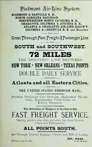In 1882, the R&D, along with the North Carolina Railroad, Northwestern North Carolina Railroad, Charlotte, Columbia and Augusta Railroad, Atlanta and Charlotte Air-Line Railway and the Columbia and Greenville Railroad lines were being operated as the Piedmont Air-Line System advertised as the shortest line between New York, New Orleans and Texas.[13] One improvement that year was the installation of two steam powered Nutter car hoists in north Danville, Virginia in order to allow truck exchange to allow cars to be exchanged across the break of gauge with the Virginia Midland Railway.[14][15]