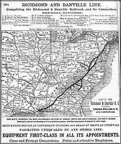 Chartered on March 9, 1847, the railroad completed its 140-mile (230 km) line between Richmond and Danville in 1856.[2] During the American Civil War, the railroad was a vital link between the Confederate capital of Richmond and the rest of the Confederacy.[3] After the Civil War, the railroad grew to become the 3,300-mile (5,300 km) Richmond and Danville Railroad Company System.