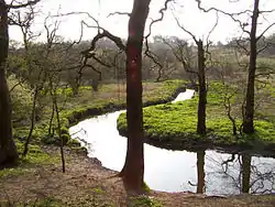 Dibbinsdale takes its name from the River Dibbin which flows through the area. It is thought to have formed part of the boundary in the 10th and 11th centuries between the Norse colony in Wirral, to the north and west, and Anglo-Saxon Mercia to the east and south. After the Norman Conquest, the whole area became part of the Hundred of Wirral.[1] In the 1800s the land on which Brotherton Park resides was part of an estate called 'Woodslee', this estate was bought in 1866 by a Liverpool Merchant called Robert Rankin who built 'Woodslee' house on the site as a wedding present for his daughter. The estate comprised Woodslee, servants cottages, a lake, stables, coach house, a walled garden and formal gardens with a rockery. At some stage it was sold William Johnston of Liverpool who is listed as living there in the 1901 Census.[2] In 1919 the estate was bought by Lord Brotherton, an industrialist and member of parliament who donated the estate to the council in the 1930s, by the 1940s the house had become dilapidated and was demolished. In 1978 Brotherton Park and Dibbinsdale was designated a local nature reserve owing to the ancient woodland and became a single entity with much of Dibbinsdale donated by the Lancelyn Green family.[3]