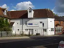 The surviving corn mill building, now just "Oxted Mill",[10] has been converted into offices. It dates from 1892-5, although on a site in use from much earlier. Originally two buildings, the older one housed an overshot wheel of 12 feet (3.7 m) diameter, breadth 5 feet 6 inches (1.7 m). The newer mill, opened on 12 June 1893, was a roller mill driven by a 4 feet (1.2 m) turbine producing 63 horsepower (47 kW) at 63 revolutions per minute.[10] The building was used as a factory for making woodworking tools in the 1950s.[2][11][12]