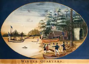 Gray set sail for the northwest coast again in the Columbia on September 28, 1790, reaching his destination in 1792.[19] Gray and Kendrick rejoined each other for a time, after Gray's return to the region.[19] On this voyage, Gray, though he was still a private merchant, was sailing under papers of the United States of America signed by President George Washington. Gray put in at Nootka Sound on June 5, 1791, and wintered at a stockade they built and named Fort Defiance. Over this winter, the crew built a 45-ton sloop named Adventure, which was launched in the spring with Gray’s first mate, Robert Haswell, in charge.[1] He sailed as far north as Haida Gwaii during his voyage.