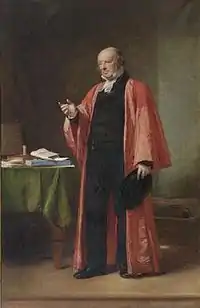 When Robert Grant, MP for Inverness Burghs, petitioned for Jewish relief in 1830, Inglis was violently opposed. Inglis alleged that the Jews were an alien people, with no allegiance to England, and that to admit Jews to parliament would "separate Christianity itself from the State."[2] He also alleged that if they were admitted to parliament "within seven years...Parliamentary Reform would be carried."[3] Inglis was joined in his public opposition by the Chancellor of the Exchequer, Henry Goulburn, and the Solicitor General and future Lord Chancellor, Sir Edward Sugden. Although the Jews were not emancipated fully until 1858, Parliamentary Reform occurred in 1832, just two years later. Inglis also likened Buddhism to "idolatry" in connection with the British colony of Ceylon (now Sri Lanka) during a debate over the relationship of "Buddhist priests" to the British colonial government in 1852.[4]