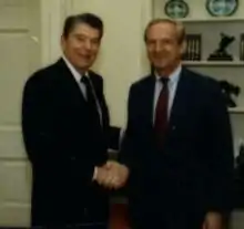![]() Pugh (right) with President Reagan, 1988 | |