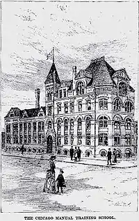 Chicago Manual Training School was a private secondary school and was designed to graduate its students three years from the time they entered. The student body, which was all male, was required to spend an hour each day in the drafting room and two hours a day in the shop, in addition to the time spent in classrooms studying the conventional high school curriculum. In 1891 the tuition averaged $100.00 per year "to those able to pay it".[24][25] In 1903 the institution became part of the University of Chicago Laboratory Schools,[26] operating out of CMTS (later Belfield) Hall.[27]