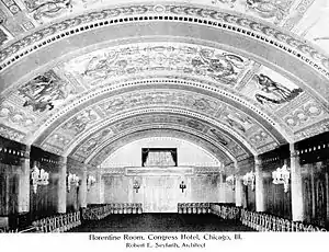 How long Maher worked for Bauer and his partners is not known, but by the 1880s he was working in the office of Joseph Lyman Silsbee, who before he became an architect had been professor of architecture at the new College of Fine Arts at Syracuse University. Silsbee was a talented architect who designed in the latest architectural fashion. He was noted for his Shingle style buildings and "... was a master of the Queen Anne style, and in gaining the romantic effect admired by his clients he depended less upon [its inherent] chaos than his contemporaries".[82] He came to Chicago in 1882 to act as an interior architect and as such was responsible for the opulent interiors of Potter and Bertha Palmer's fantastic castle[83] at 1350 N. Lake Shore Drive (built 1881-1885, demolished 1950,[84] Henry Ives Cobb (1859–1931) and Charles Sumner Frost (1856–1931) architects), and stayed to design several important projects for the city, including the Lincoln Park Conservatory (1890–1895) and the West Virginia Building and the Moving Sidewalk for the World's Columbian Exposition (1893). While he worked for Silsbee, Maher worked alongside George Grant Elmslie (1869–1952), Frank Lloyd Wright (1867–1959) and Irving Gill (1870–1936), who would each later become prominent architects, although with decidedly different architectural styles. In 1888 Maher established his own office with Charles Corwin, a relationship that lasted until about 1893. He briefly enjoyed a professional relationship with Northwestern University in Evanstion, Illinois, where in 1909 (during Seyfarth's tenure in his office) he designed Swift Hall and the first Patten Gymnasium (demolished 1940). These buildings were bold expressions of his unique design philosophy and were to have been integral parts of his master plan for the campus, which the board of trustees had commissioned through a competition in 1911 but failed to execute. This prompted one commentator in later years to lament "It's probably the most regrettable loss in Northwestern architectural history: the unique Prairie School campus that never was".[85] Frank Lloyd Wright would have predicted the outcome. What follows is point 13 in his list of advice given "To the young man in architecture": "Enter no Architectural competition under any circumstances except as a novice. No competition ever gave to the world anything worth having in Architecture. The jury itself is a picked average. The first thing done by the jury is to go through all the designs and throw out the best and the worst ones so as an average, it can average upon an average. The net result of any competition is an average by the average of averages.".[86]